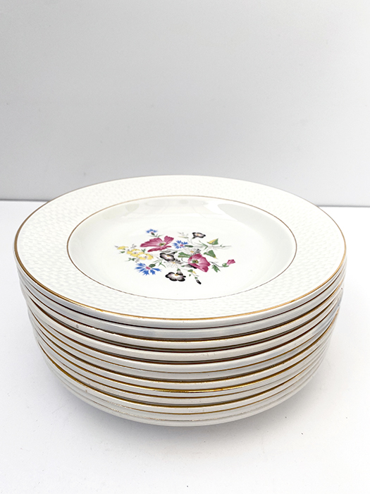 12 assiettescreuses de la faïencerie Digoin & Sarreguemines, France . Bon état général. Liseré doré et bord en relief. Véritable Opaque. Motif « Floralies » . Couleur blanche. Signées et numérotées au dos. Prix pour le lot.