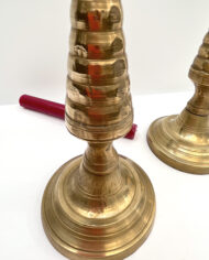 2 bougeoirs en laiton décoré en bon état général. Quelques petits défauts dus à leur âge. Tellement joli sur une table de fête. Prix pour les deux.