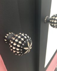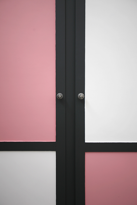 Armoire Art Déco transformée en dressing. Elle a été entièrement rénovée. L’extérieur après avoir été poncé et sous-couché a été repeint en Pitch Black et All White du nuancier Farrow&Ball ainsi qu’en Rose fabrication Maison. Poignées neuves en bois. L’intérieur a été repeint en bleu Indigo du nuancier Guittet. Il a été aménagé avec d’un côté 4 étagères et de l’autre 1 étagère et une tringle. Les étagères sont recouvertes de tissus motif graphique.