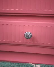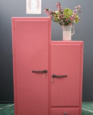 Armoire années 30 entièrement rénovée. De belle facture, sa forme asymétrique est très recherchée. Elle a été repeinte en rose pump extérieurement ainsi qu’à l’intérieur des portes. Quelques défauts normaux dus à son âge. Magnifiques poignées de porte d’origine repeintes en gris moyen. 2 Clés d’origine. Une tringle coulissante dans la partie haute et 3 étagères dans la partie basse. Les étagères et le fond de l’armoire ont été tapissés d’un très joli coton graphique. 1 tiroir avec un bouton neuf. Pièce unique.