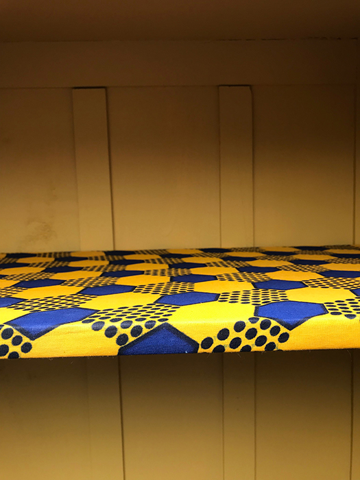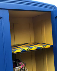 Très grande armoire parisienne entièrement rénovée. Sa structure a été poncée puis repeinte en bleu franc. L’intérieur a été peint en jaune moutarde . 1 étagère recouverte de tissus jaune et bleu. 1 tringle. Une clé. Étiquette La Mauvaise Réputation. Repeinte sur mesure.