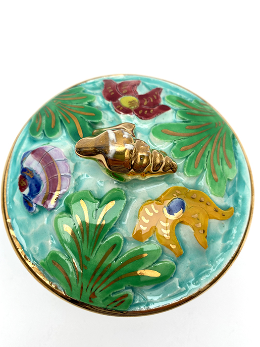Peut être le début d’une nouvelle collection ! Après le Vallauris, le Monaco. Ancienne petit boîte en céramique avec son couvercle. Décor fond marin et poissons polychromes avec reliefs et dorures. La Dorure sur le dessus du couvercle est légèrement passée (photo). L’intérieur est en céramique bleu azur. J’adore la tête des poissons :-). En très bon état, pas de brèches ou fêlures.