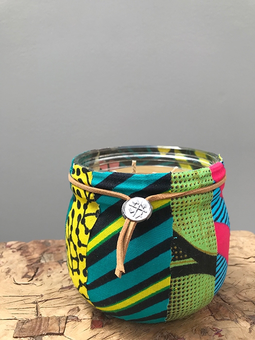 Cette bougie a été coulée à la main dans un support en verre chiné (ancienne ventouse) puis recouvert de tissus en coton coloré : le Wax.