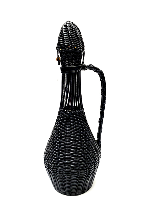 Jolie Bouteille en verre épais recouverte de Scoubidou noir, ce qui est assez rare. Présence du bouchon et du système de fermeture. Bon état général.