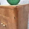 Petit buffet en bois  avec de jolies marqueteries sur les portes. La structure est en bon état malgré quelques légères traces du temps, notamment sur le côté droit ( photo). Ce buffet a été entièrement poncé, nettoyé, traité puis ciré. Les 2 étagères ainsi que le plateau  sont recouverts de papier peint haut de gamme à motif art déco doré. Le reste de l’intérieur a été nettoyé. 2 jolies poignées neuves ont été fixées sur les portes. Pieds galbés.