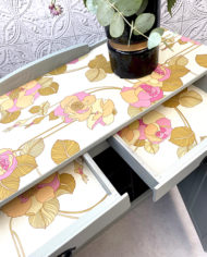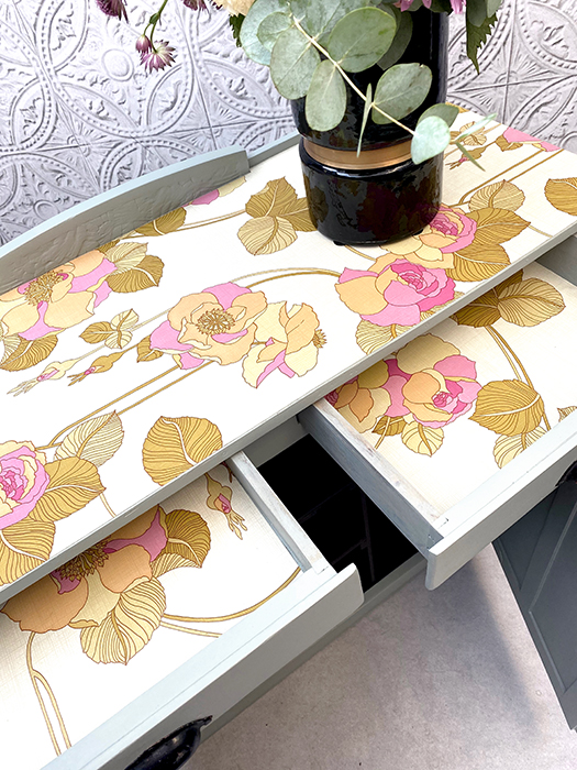 Buffet parisien en bois ancien. Il comporte de nombreuses traces de vrillettes qui ont été traitées et rebouchées. L’extérieur a été repeint en Pigeon du nuancier Farrow&Ball. L’intérieur des 2 tiroirs ainsi que le dessus a été recouvert de papier vintage peint à motif floraux. L’intérieur a été repeins en marron chocolat. 2 jolies poignées anciennes, sur les deux tiroirs et les deux portes.