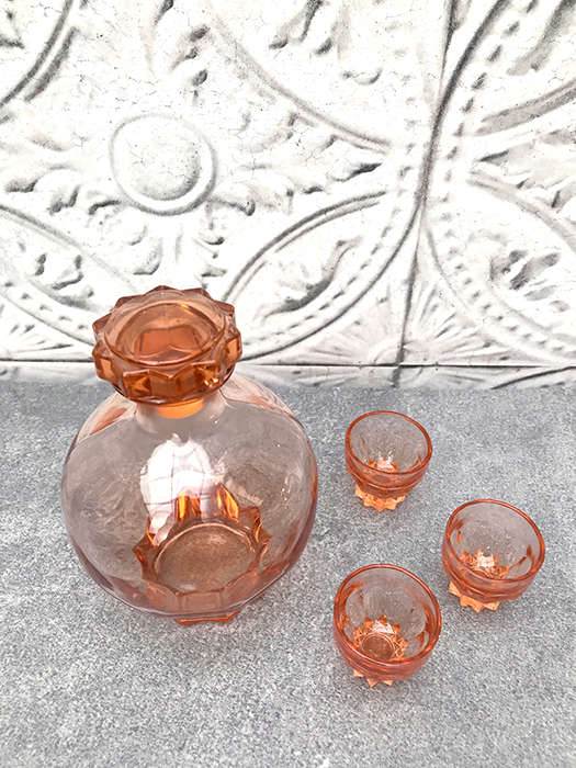 Classique du style Art Deco cette petite carafe à liqueur ! Le verre est de couleur rose. Elle est vendue avec son bouchon et 3 petits verres en bon état. 2 autres verres sont offert en supplément car légèrement ébréchés..