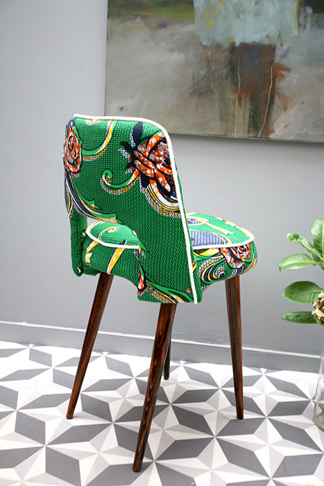 Ancienne chaise vintage entièrement retapissée. Le piétement est en bois, il a été nettoyé. Pieds compas. L’assise et le dossier ont été recouvert avec un tissus Wax neuf dans les tonalités vertes, orangées et blues. La mousse a été changée. Sa petite taille le rend logeable de la chambre à la salle à manger. Stable et confortable.
