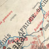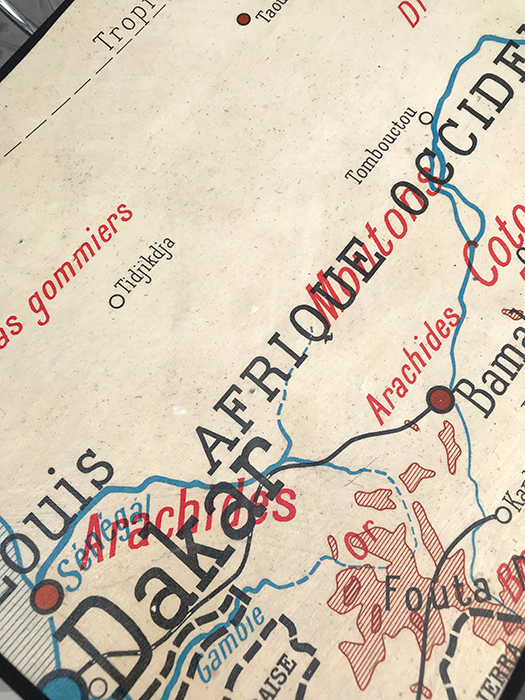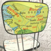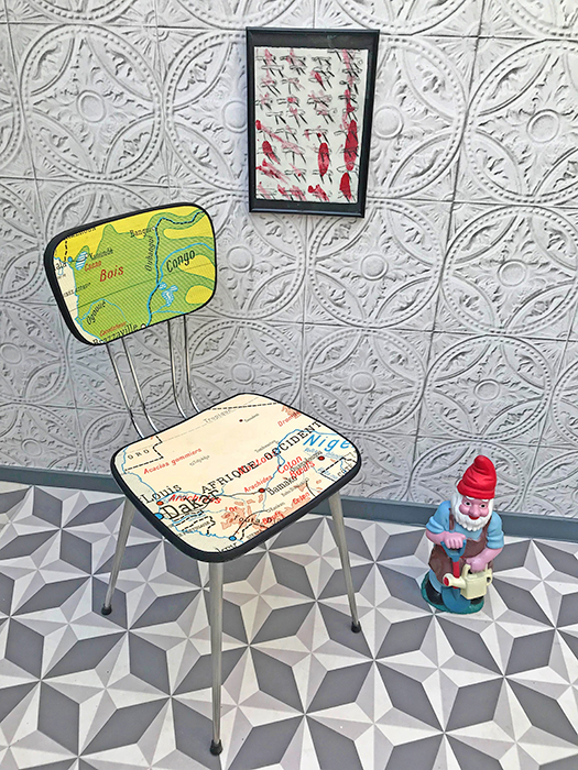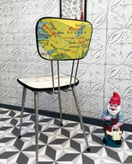 Ancienne chaise entièrement retravaillée. L’assise et le dossier ont été recouvert avec une ancienne carte scolaire. Cette carte est ancienne et comportait quelques défauts et taches. C’est bien l’original de la carte qui a été fixée sur la chaise. Celle ci est recouverte à la main et est UNIQUE. L’assise et le dossier ont ensuite été cerclés de percale de coton noir mat puis vernis et sont donc lessivable. Structure chrome en bon état qui a été entièrement brossée pour nettoyer les traces de piqué. Patins caoutchouc noir neufs. Étiquette La Mauvaise Réputation.