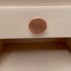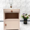 Ancien chevet en bois entièrement repeint en Setting Plaster du nuancier Farrow&Ball. Il comporte un tiroir, une niche et un petit placard. Le fond du placard et des tiroirs a été tapissé avec un papier peint NLXL By Piet Hein Eek. Petits pieds effilés. Il a quelques traces de vrillettes qui ont été traitées. Poignées couleur cuivre anciennes.A détourner dans une entrée ou en bout de canapé. Parfait aussi en table de nuit.