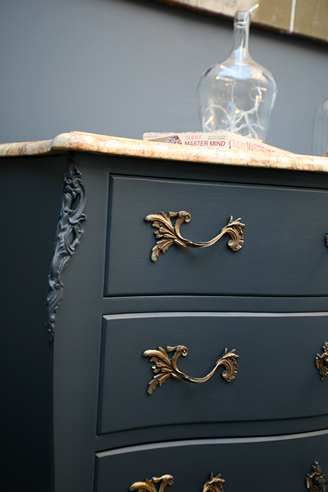 Belle commode ancienne en plaquage de bois de rose et marqueterie. 3 tiroirs «montage en queue d’arronde». Bronzes d’ornement et pieds sabots, Plateau en marbre. Signée par les ébénistes Marquant P. Elle a été repeinte extérieurement en Off Black du nuancier Farrow&Ball pour s’harmoniser avec son futur intérieur. Réalisation sur commande, elle est donc vendue.