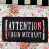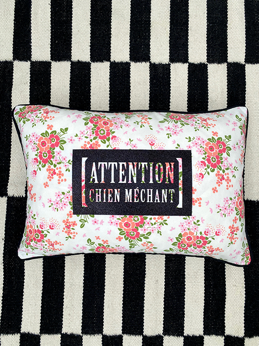 – Ce coussin à été floqué par notre Fée Floqueuse sur la face avant en noir pailleté [ATTENTION CHIEN MÉCHANT].