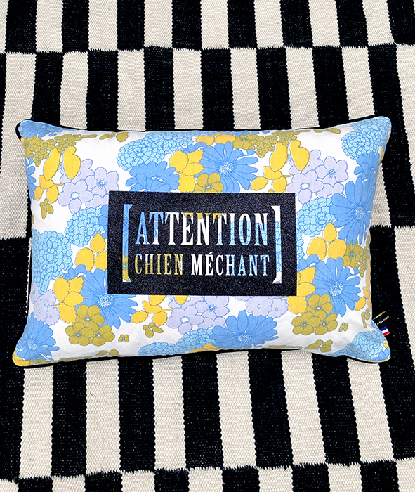 – Ce coussin à été floqué par notre Fée Floqueuse sur la face avant en noir pailleté [ATTENTION CHIEN MÉCHANT].