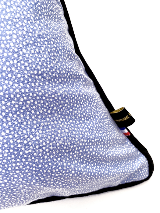 – Le coussin est déhoussable et la housse lavable. Passe poil et glissière métal noire. Tout l’assemblage est fait à la main par notre Fée Couturière, en France bien-sur. Chaque pièce est cousue avec Amour. Nous avons ajouté un petit drapeau Bleu Blanc Rouge et l’étiquette LMR sur le côté.