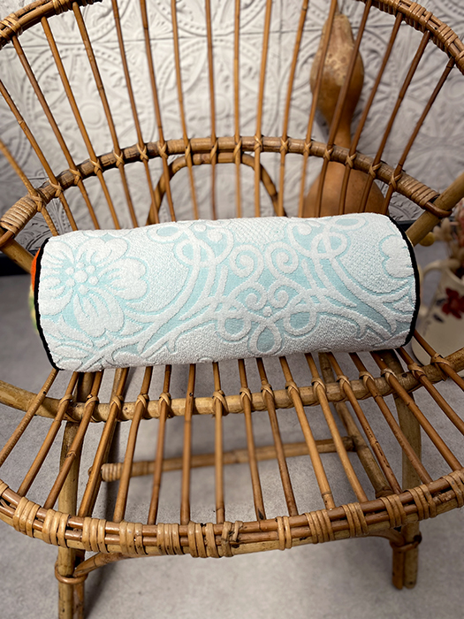 Coussin crée à partir de tissu ancien chiné. Il s’agit d’anciennes petites serviettes éponges achetées une à une au bon gré de la chine.