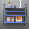 Ancienne étagère string dont les étagères ont été repeintes en bleu klein. Quelques traces et défauts du à son âge. Une planche n’a qu’une petite attache d’un côté mais elle a bien les deux de l’autre côtés. Montant en fer noir. 4 Planches de bois. Pièce unique.
