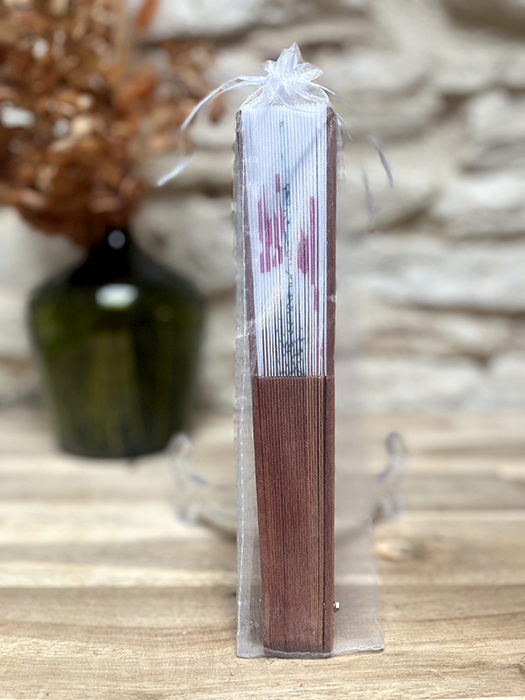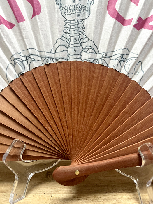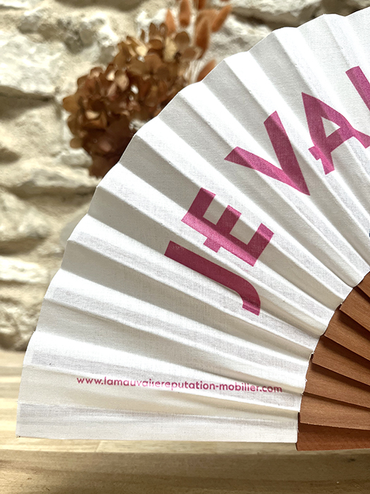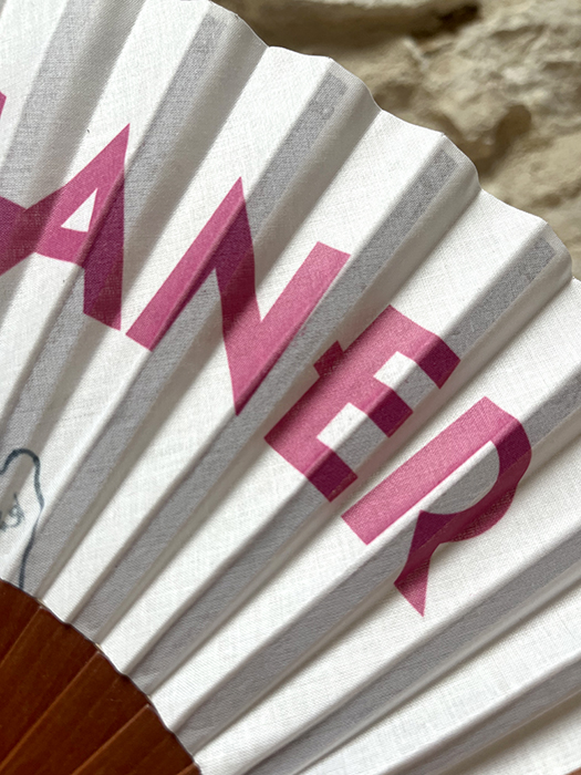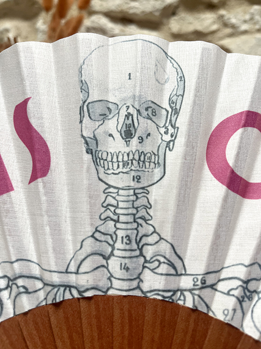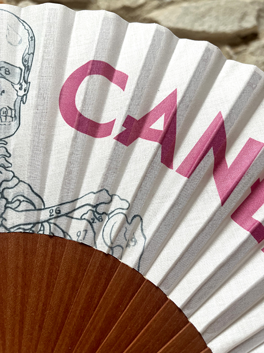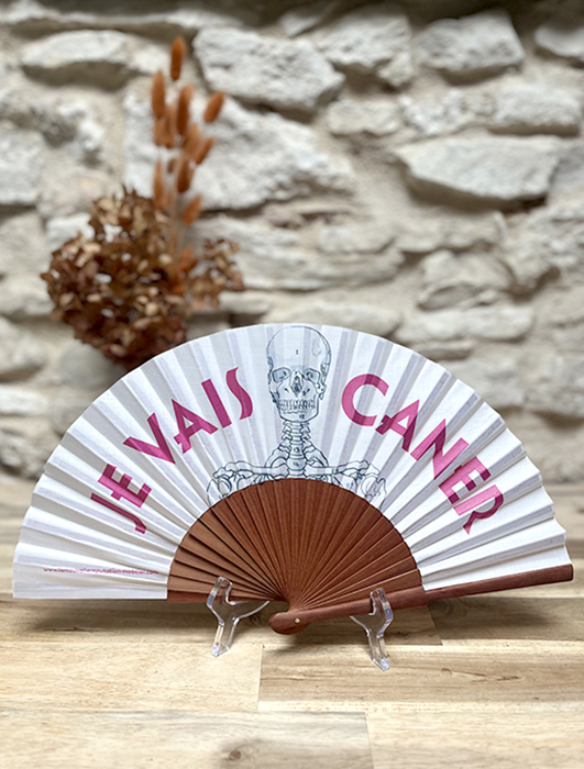 Éventail imprimé avec un squelette et une gouttelette de sueur et l’expression Marseillaise  » Je Vais Caner ». Ce qui signifie ici « je vais mourir de chaud ». Inscription rose fuchsia sur tissu blanc. Manche en bois de pommier. Graphisme réalisé par mes soins et fabrication à Marseille.