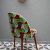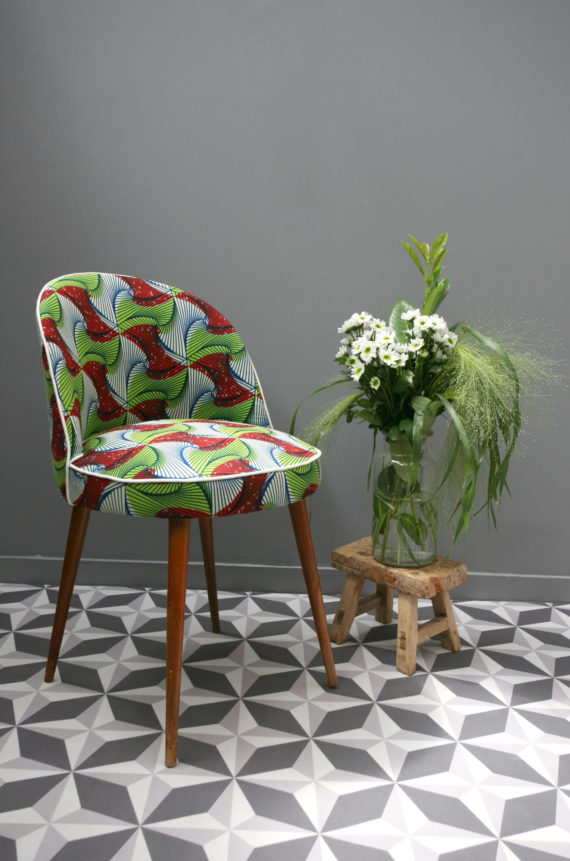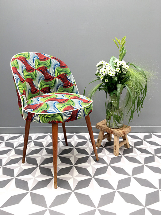 Ancien fauteuil cocktail entièrement restauré. Il a été recouvert avec un tissus Wax aux tonalités vertes par notre artisan tapissier. Bien stable. Confortable. Et très logeable. Passe poil blanc cassé. Pieds compas bois.