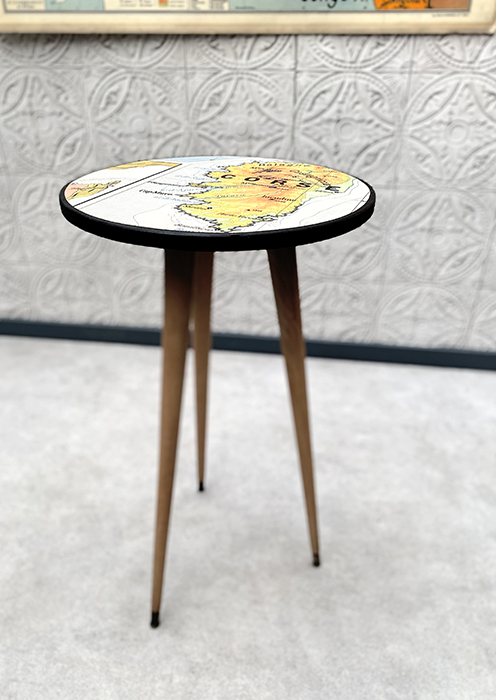 Le plateau de ce petit gueridon à été recouvert avec une carte scolaire vintage originale. Chaque carte est chinée et est ancienne. De ce fait elle comporte quelques défauts et des petites taches du à son âge. C’est bien l’original de la carte qui a été fixé sur la table. Celle ci est recouverte à la main et est UNIQUE.