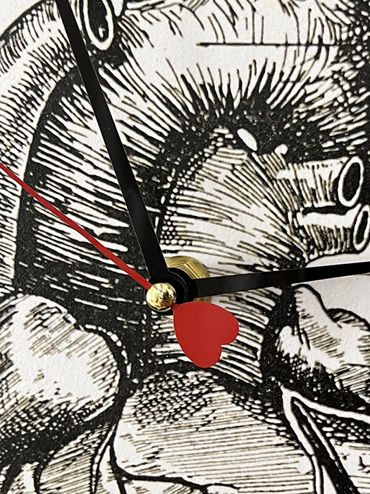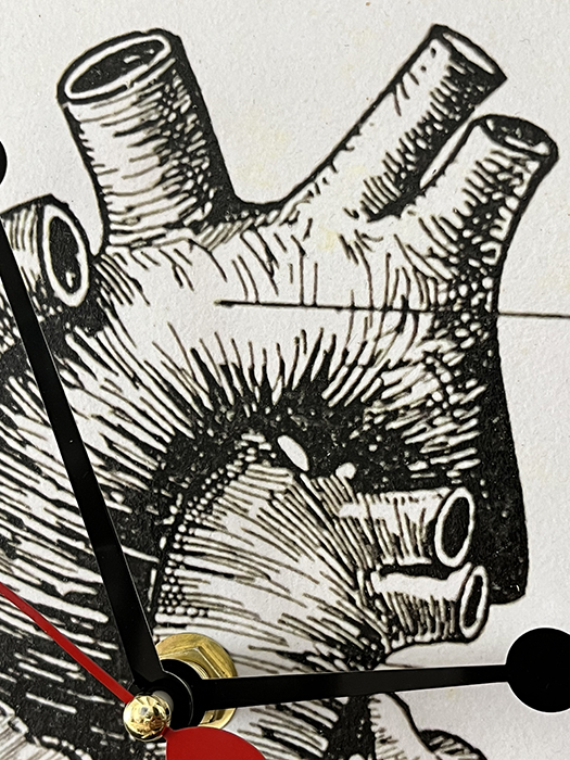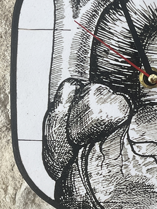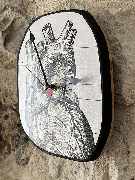 Horloge murale en bois naturel de teck massif. Recouvert au recto avec une reproduction d’une gravure très ancienne issue d’une encyclopédie médicale vintage. Elle est ensuite vernis plusieurs fois. Et enfin cerclée de percale de coton noir. Le mécanisme horloger quartz est neuf. Aiguilles noires et trotteuse rouge en forme de cœur 💕 .