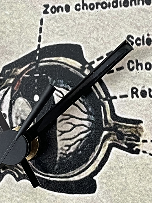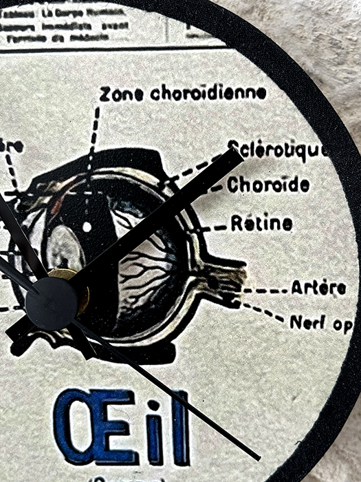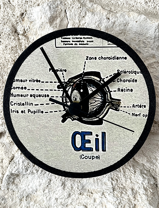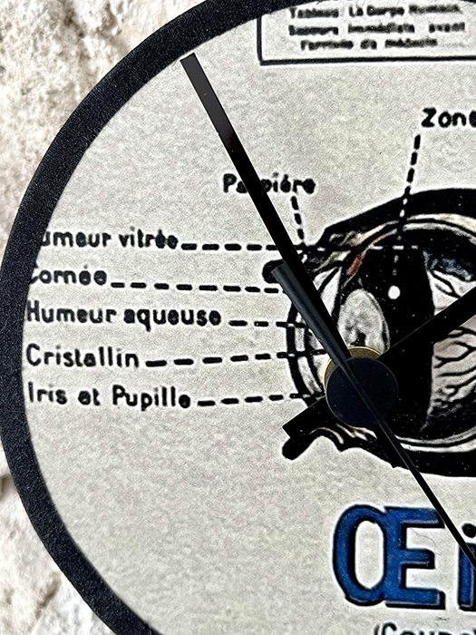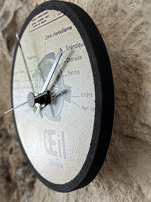 Horloge murale en bois naturel de pin massif. Recouvert au recto avec une reproduction d’une partie d’une affiche ancienne anatomique Armand Colin.Elle est ensuite vernis plusieurs fois. Et enfin cerclé de percale de coton noir. Le mécanisme horloger est neuf et à quartz. Aiguilles noires . Pile non fournie.
