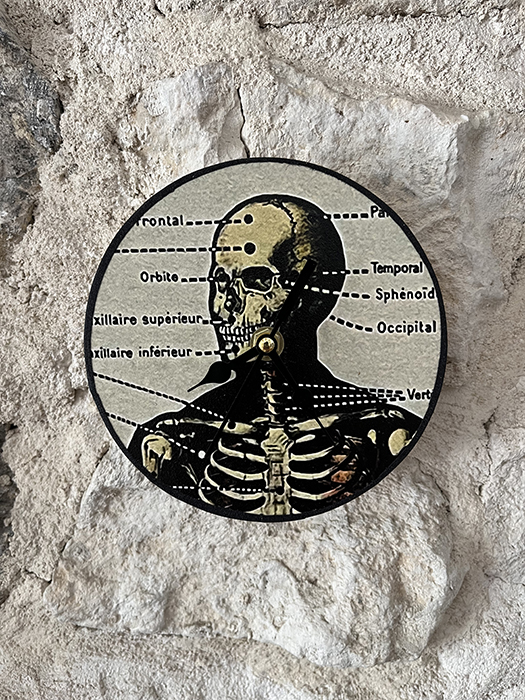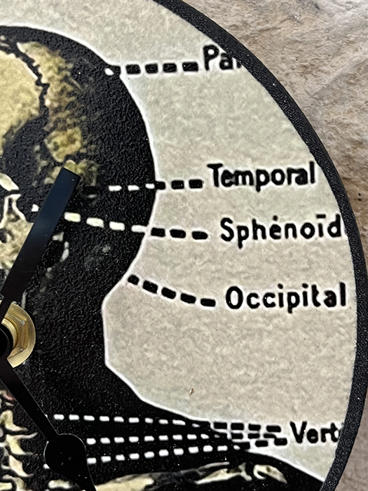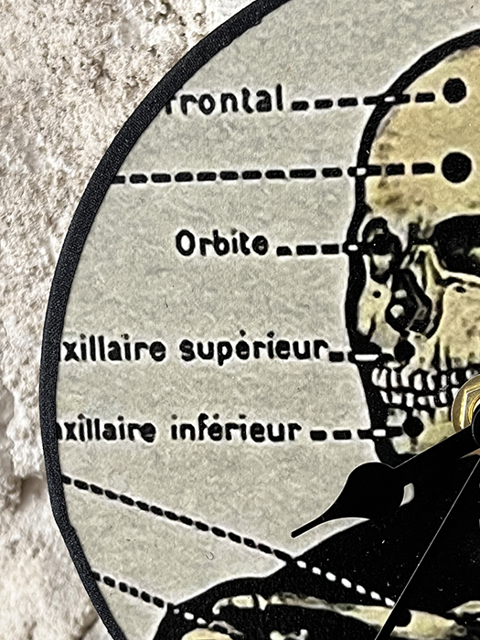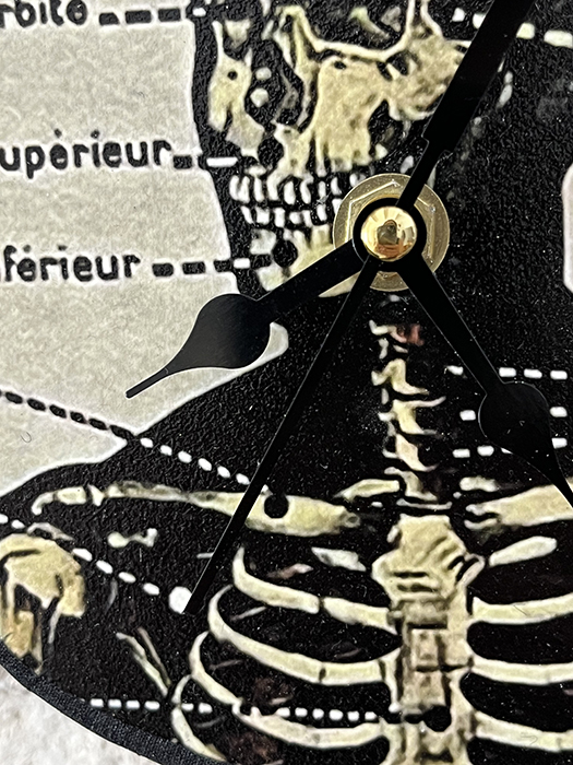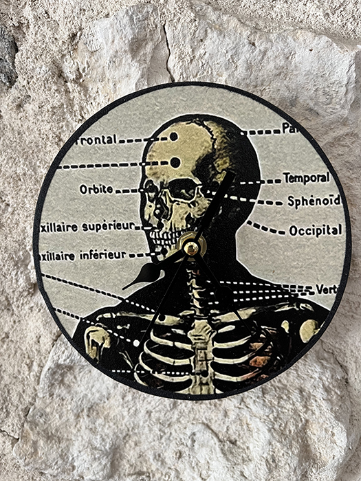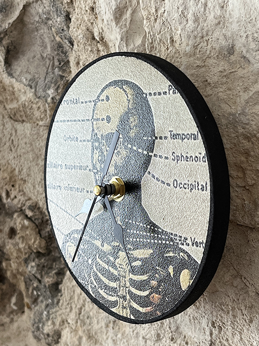 Horloge murale en bois naturel de pin massif. Recouvert au recto avec une reproduction d’une partie d’une affiche ancienne anatomique Armand Colin. Elle est ensuite vernis plusieurs fois. Et enfin cerclée de percale de coton noir. Le mécanisme horloger est neuf et à quartz. Aiguilles noires . Pile non fournie.