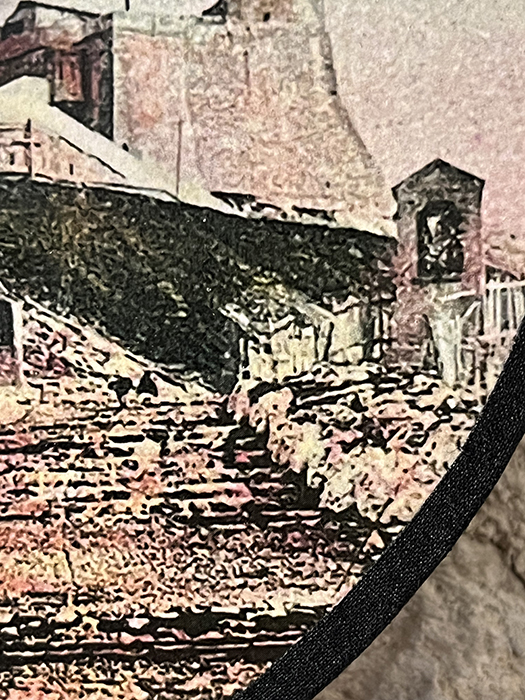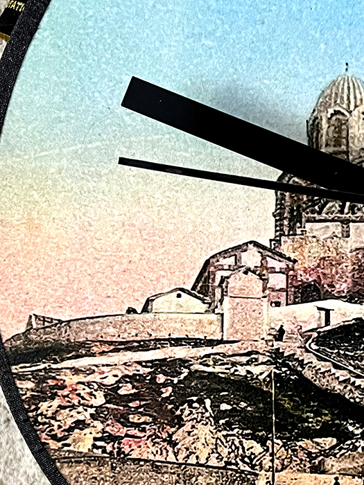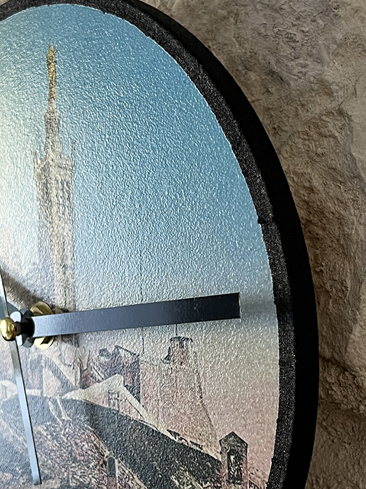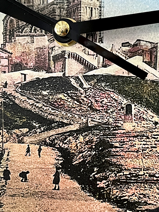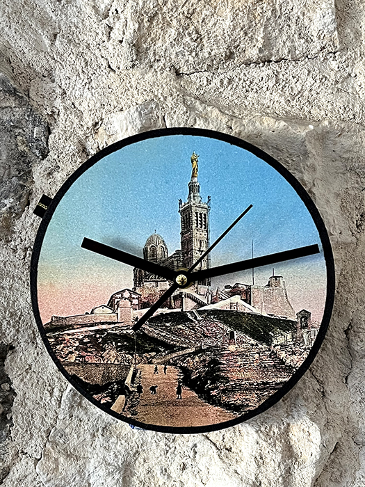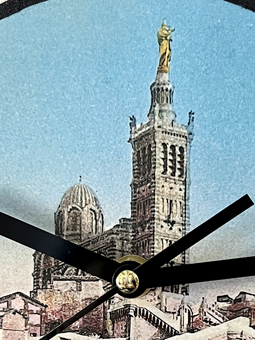 Horloge murale en bois naturel contreplaqué. Recouvert au recto avec une reproduction d’une partie d’une carte postale vintage retravaillée. Elle est ensuite vernis plusieurs fois. Et enfin cerclée de percale de coton noir. Le mécanisme horloger est neuf et à quartz. Aiguilles noires . Pile non fournie.
