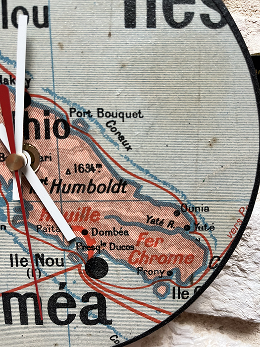 Horloge murale en bois naturel massif. Recouvert au recto avec une partie de carte scolaire ancienne originale. Chaque carte est chinée et de ce fait comporte quelques défauts et des petites taches dues à son âge. C’est bien l’original de la carte qui a été fixée sur le support. Celle ci est collée à la main et est UNIQUE. Elle est ensuite vernis plusieurs fois. Et enfin cerclé de percale de coton noir. Le mécanisme horloger à été monté par le bijoutier horloger « Bijouterie Choiseul Paris » et est allemand.