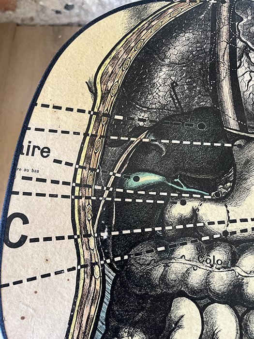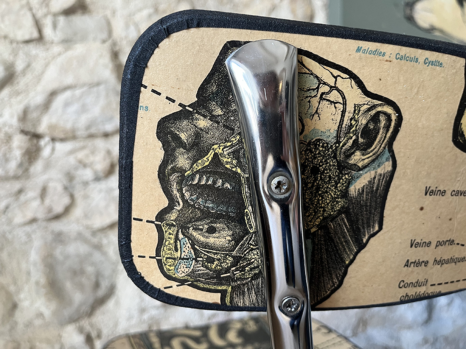 L’assise et le dossier ont été recouverts avec une VÉRITABLE carte scolaire vintage originale. Chaque carte est chinée et est ancienne. De ce fait elle comporte quelques défauts (pliures, manque, petites taches…) dus à son âge. C’est bien l’original de la carte qui a été fixé sur la chaise. Celle ci est recouverte à la main et est UNIQUE. L’assise et le dossier ont ensuite été vernis puis cerclés de percale de coton noir mat. Cette chaise est lessivable. Elle reste cependant un objet artisanal à traiter avec soin. Ne convient pas pour un usage intensif.