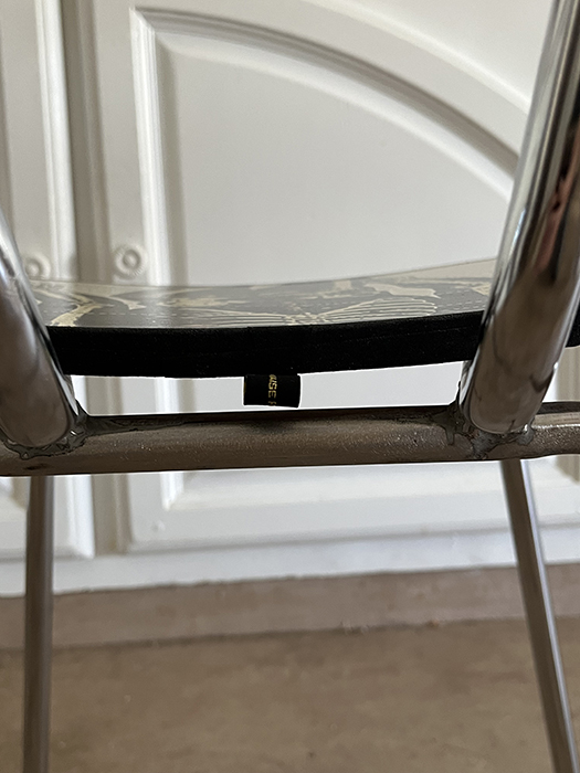 L’assise et le dossier ont été recouverts avec une reproduction de l’affiche numéro 7 de la Collection des tableaux Muraux Armand Colin. L’assise et le dossier ont ensuite été vernis puis cerclés de percale de coton noir mat. Cette chaise est lessivable. Elle reste cependant un objet artisanal à traiter avec soin. Ne convient pas pour un usage intensif. Premier prototype d’une prochaine série. Le prix en tient compte. idéal en décoration.