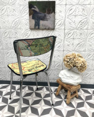Ancienne chaise entièrement retravaillée. L’assise et le dossier ont été recouvert avec une carte scolaire vintage cartonnée. De ce fait elle comporte des défauts et des taches ainsi que quelques pliures du à son âge. C’est bien l’original de la carte qui a été fixé sur la chaise. Celle ci est recouverte à la main et est UNIQUE. L’assise et le dossier ont ensuite été vernis puis cerclés de percale de coton noir mat. Cette chaise est lessivable. Structure tubulaire en chrome qui a été brossée pour nettoyer les traces de piqué et certain endroits qui s’écaillaient. Étiquette La Mauvaise Réputation.