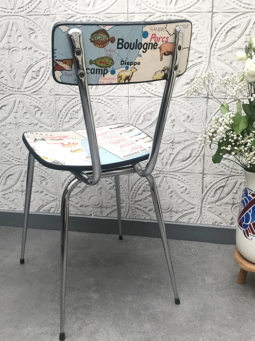 Ancienne chaise entièrement retravaillée. L’assise et le dossier ont été recouvert avec une carte scolaire vintage assez used. Elle comporte des défauts et pas mal de taches dus à son âge. Chaque carte est chinée et est ancienne. Ce modèle sera assez mignon pour une chaise de bureau par exemple. C’est bien l’original de la carte qui a été fixé sur la chaise. Celle ci est recouverte à la main et est UNIQUE. L’assise et le dossier ont ensuite été vernis puis cerclés de percale de coton noir mat. Cette chaise est lessivable. Structure tubulaire en chrome qui a été brossée pour nettoyer les traces de piqué. Embouts aux pieds. Étiquette La Mauvaise Réputation.