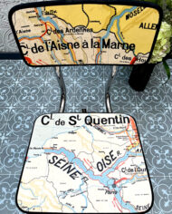 L’assise et le dossier ont été recouverts avec une VÉRITABLE carte scolaire vintage originale. Chaque carte est chinée et est ancienne. De ce fait elle comporte quelques défauts (pliures, manque, petites taches…) dus à son âge. C’est bien l’original de la carte qui a été fixé sur la chaise. Celle ci est recouverte à la main et est UNIQUE. L’assise et le dossier ont ensuite été vernis puis cerclés de percale de coton noir mat. Cette chaise est lessivable. Elle reste cependant un objet artisanal à traiter avec soin. Ne convient pas pour un usage intensif.