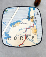 L’assise a été recouverte avec une carte scolaire vintage originale. Chaque carte est chinée et est ancienne. De ce fait elle comporte quelques défauts et des petites taches du à son âge. C’est bien l’original de la carte qui a été fixé sur la chaise. Celui ci est recouverte à la main et est UNIQUE. L’assise a ensuite été cerclée de percale de coton noir mat. Ce tabouret est donc lavable.