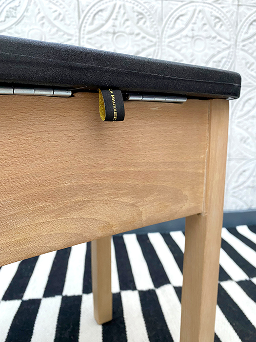 Celui ci est un ancien tabouret de cireur avec un petit coffre que j’ai entièrement repeint en Pitch Black du nuancier Farrow&Ball. Les charnières trop anciennes ont été remplacées.