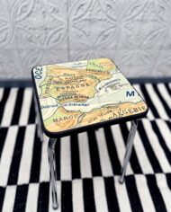 Tabouret “VOUS ÊTES ICI”. Ancien tabouret entièrement retravaillé. L’avantage d’un tabouret c’est qu’il peut aussi servir de petite table d’appoint, de bout de canapé ou de table de nuit.