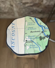 L’assise a été recouverte avec une carte scolaire vintage originale. Chaque carte est chinée et est ancienne. De ce fait elle comporte quelques défauts et des petites taches du à son âge. C’est bien l’original de la carte qui a été fixé sur le tabouret. Celui ci est recouvert à la main et est UNIQUE. L’assise a ensuite été cerclée de percale de coton noir mat. Ce tabouret est donc lavable. Il reste cependant une pièce artisanale à manipuler avec soin. Ne convient pas pour un usage intensif.