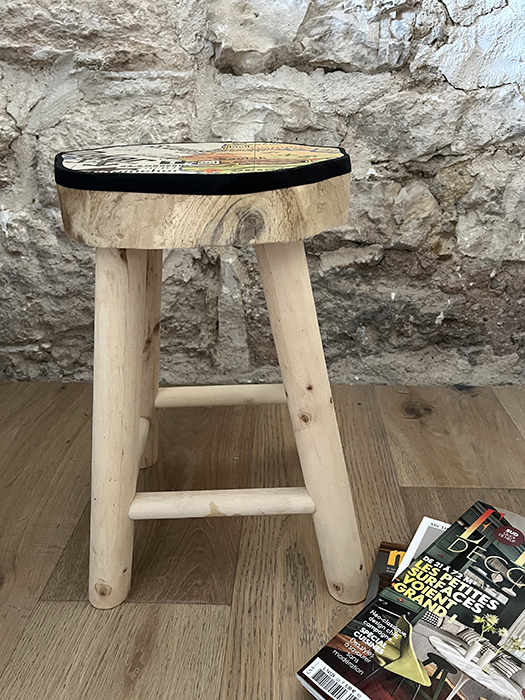 Tabouret “VOUS ÊTES ICI”. Tabouret brut en bois de Paulownia. Neuf et artisanal. Forme libre. L’avantage d’un tabouret c’est qu’il peut aussi servir de petite table d’appoint, de bout de canapé ou de table de nuit.
