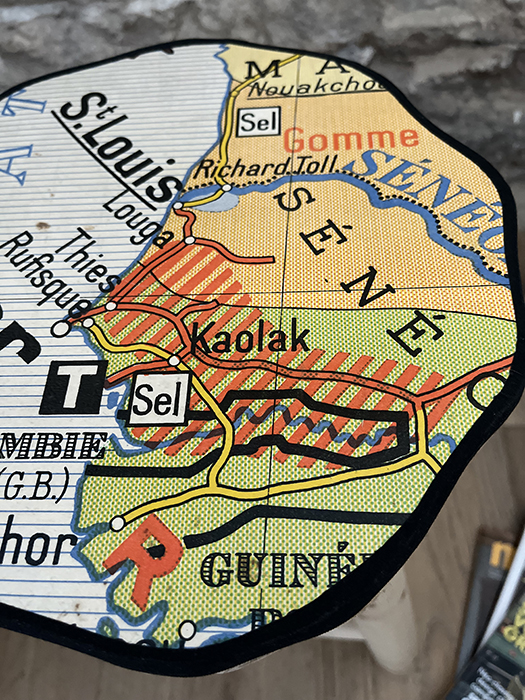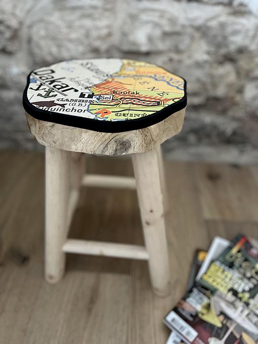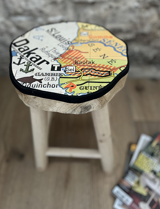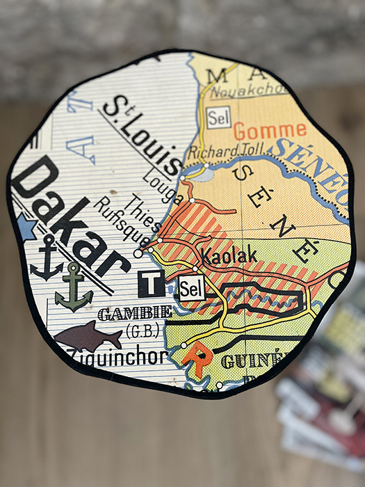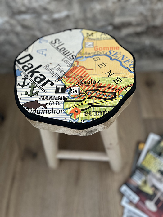 L’assise a été recouverte avec une carte scolaire vintage originale.  Chaque carte est chinée et est ancienne. De ce fait elle comporte quelques défauts et des petites taches du à son âge. C’est bien l’original de la carte qui a été fixé sur le tabouret. Celui ci est recouvert à la main et est UNIQUE. L’assise a ensuite été cerclée de percale de coton noir mat. Ce tabouret est donc lavable. Il reste cependant une pièce artisanale à manipuler avec soin. Ne convient pas pour un usage intensif.