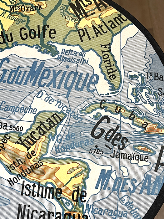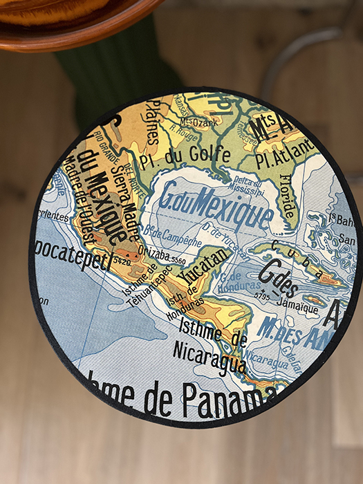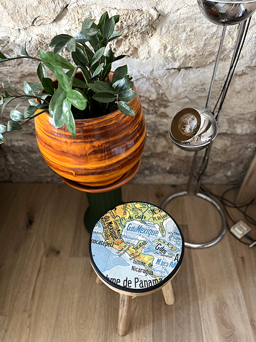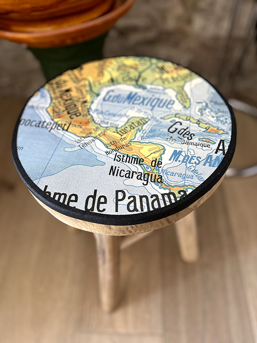 L’assise a été recouverte avec une carte scolaire vintage originale.  Chaque carte est chinée et est ancienne. De ce fait elle comporte quelques défauts et des petites taches du à son âge. C’est bien l’original de la carte qui a été fixé sur la chaise. Celui ci est recouverte à la main et est UNIQUE. L’assise a ensuite été cerclée de percale de coton noir mat. Ce tabouret est donc lavable. Il reste cependant une pièce artisanale à manipuler avec soin. Ne convient pas pour un usage intensif.
