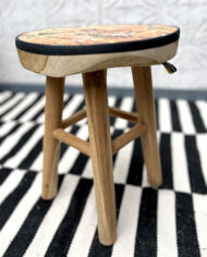 L’assise a été recouverte avec une carte scolaire vintage originale.  Chaque carte est chinée et est ancienne. De ce fait elle comporte quelques défauts et des petites taches du à son âge. C’est bien l’original de la carte qui a été fixé sur la chaise. Celui ci est recouverte à la main et est UNIQUE. L’assise a ensuite été cerclée de percale de coton noir mat. Ce tabouret est donc lavable. Il reste cependant une pièce artisanale à manipuler avec soin. Ne convient pas pour un usage intensif.