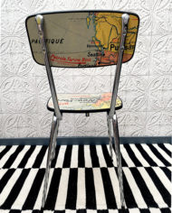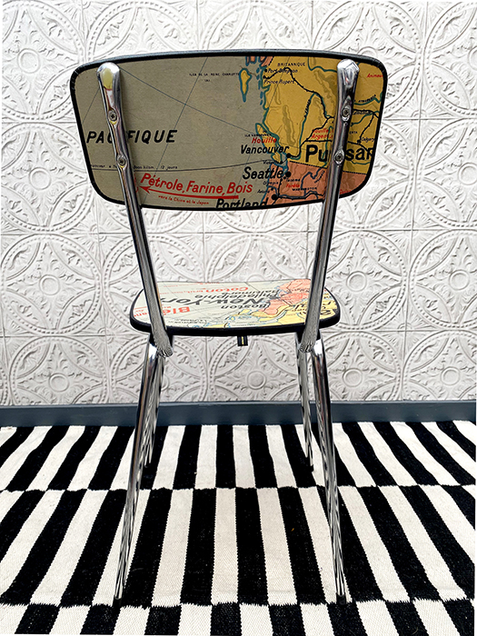 • Toutes ces chaises, tabourets, tables (…) sont faits à la main artisanalement à partir d’objets vintage, anciens. Vive le surcyclage ! Les structures bois sont toujours poncées, huilées ou vernis, les structures tubulaires en chrome sont brossées pour nettoyer les traces de piqué, mais certaines traces ou manques persistent et cela est garant de leur authenticité. L’assise et le dossier ou plateaux sont ensuite vernis et cerclés de percale de coton noir mat. Tout est donc lessivable. Attention cependant ces pièces restent à manipuler avec soin et ne conviennent pas à un usage intensif.