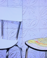 Refaire une chaise carte, produit signature « La Mauvaise Réputation » avec une carte scolaire vintage qu’elle venait de chiner, pour l’émission « Affaire Conclue, LaVie des Objets ». France 2
