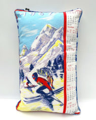 Mini coussin crée à partir d’un calendrier en tissu à motif de fleurs. J’adore ces anciens calendriers publicitaires, ultra kitsch et graphique à la fois. Cela fait plusieurs années déjà que je les réinvente en coussin. Rembourrage ouate anti acarien. Année 1967. Nous l’avons “plié” en deux afin de créer un modèle plus petit. Visuel au verso, calendrier au recto. Passe poil réalisé sur mesure avec un tissu ancien.