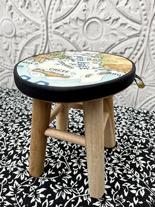 Le dessus a été recouvert avec une carte scolaire vintage originale. Chaque carte est chinée et est ancienne. De ce fait elle comporte quelques défauts et des petites taches du à son âge. C’est bien l’original de la carte qui a été fixé sur le tabouret. Celui ci est recouverte à la main et est UNIQUE. L’assise a ensuite été cerclée de percale de coton noir mat. Ce tabouret est donc lavable. Il reste cependant une pièce artisanale à manipuler avec soin. Ne convient pas pour un usage intensif.