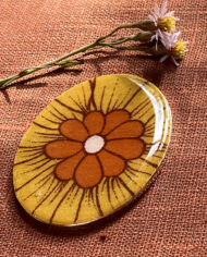 Exclu Web !!! 9 petits miroirs de poche. Tous différents. Chaque miroir est vintage, chromé, années 80. Forme ovale. Il est recouvert au verso par un tissu vintage Seventies. Motif de fleurs. Puis une résine est appliquée afin de protéger le tissu et de rendre l’objet brillant. Chaque pièce est unique et faite à la main d’où quelques petites imperfections. Chaque miroir est une création artisanale que vous ne retrouverez nul par ailleurs. Je n’en ai réalisé que 9 , il n’ y en aura pas d’autres. Chaque miroir est vendu avec sa petite pochette en velours noir. C’est bien l’original du tissu qui a été fixé sur le support.