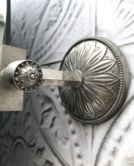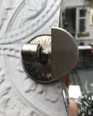 Grand miroir rond avec contour biseauté. Ancien. Bon état général. Chose rare il a encore ses deux systèmes de fixation sur les cotés. Il est inclinable. Quelques traces de piqués.Un jolie pièce, idéal dans une salle de bain