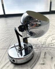 Rare. Paire d’appliques Space Age, années 70. Chrome extérieur et blanc intérieur. Orientable. À fixer en applique ou au plafond, peut même se transformer en lampe à poser. Très bon état. Forme EyeBall de la marque « See Delmas ». Vous connaissez bien sûr « See Delmas », la fameuse lampe ressort avec son gros globe. Je l’avais petite sur ma table de nuit… désespoir de ne pas savoir ou elle a bien pu passer. Bref une belle chine pour 2 belles appliques. Prix pour les deux.