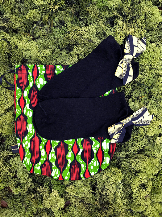 Nouvelle création La Mauvaise Réputation : les Paires de chaussette Nœud. Chaque paire de chaussettes est unique. Chaque nœud est confectionné manuellement puis cousu sur la chaussette. Chaque nœud est unique réalisé en tissus Wax africain. Chaussette de couleur noire. Basse. Taille unique pointure 36 à 41. Chaque paire est vendue avec son petit pochon réalisé lui aussi entièrement à la main. Artisanat forever.