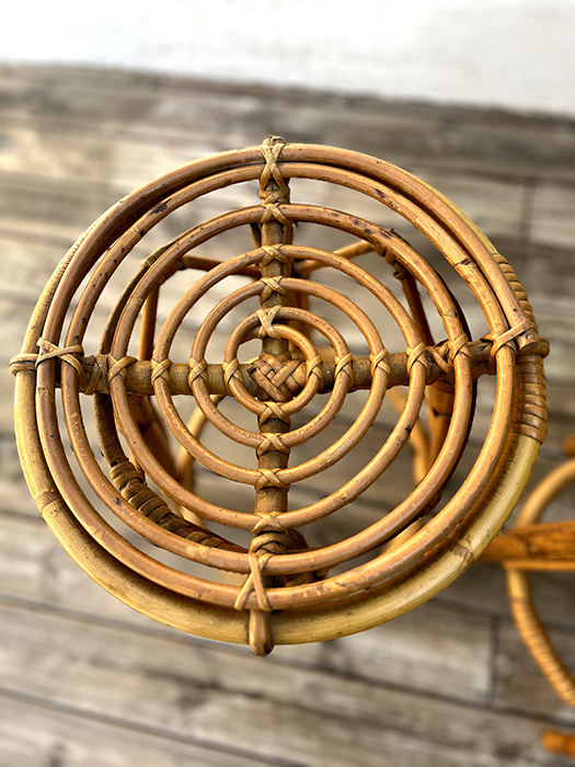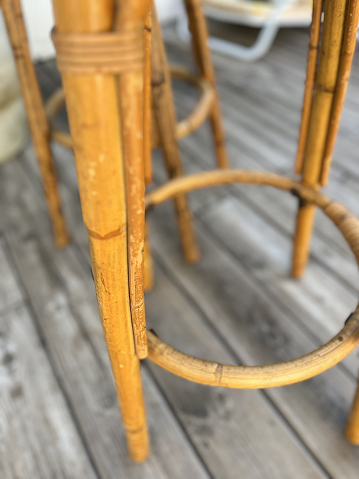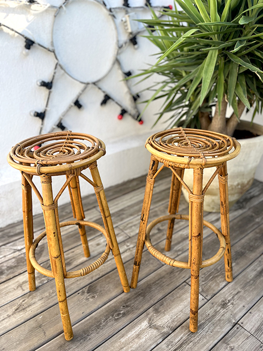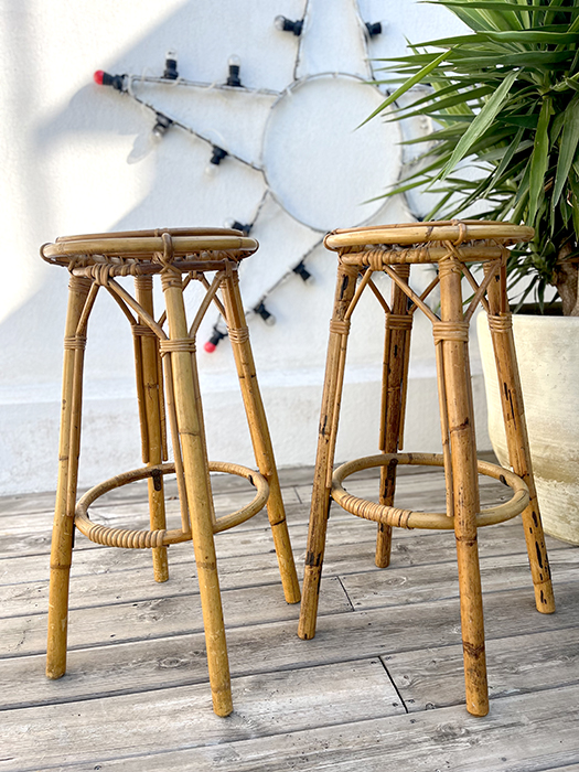 Paire de tabourets en rotin et bambou. Idéal avec un bar assorti. Traces d’usage. Bon état général . Prix pour les 2